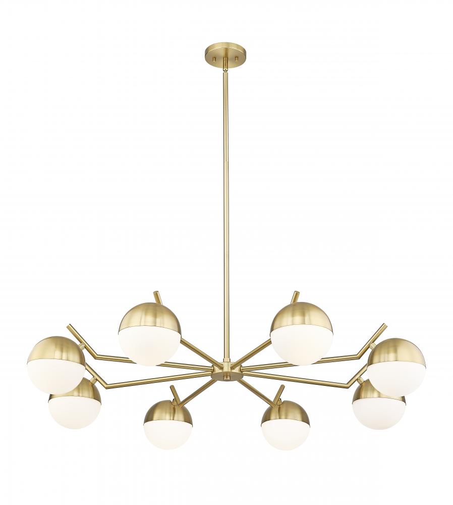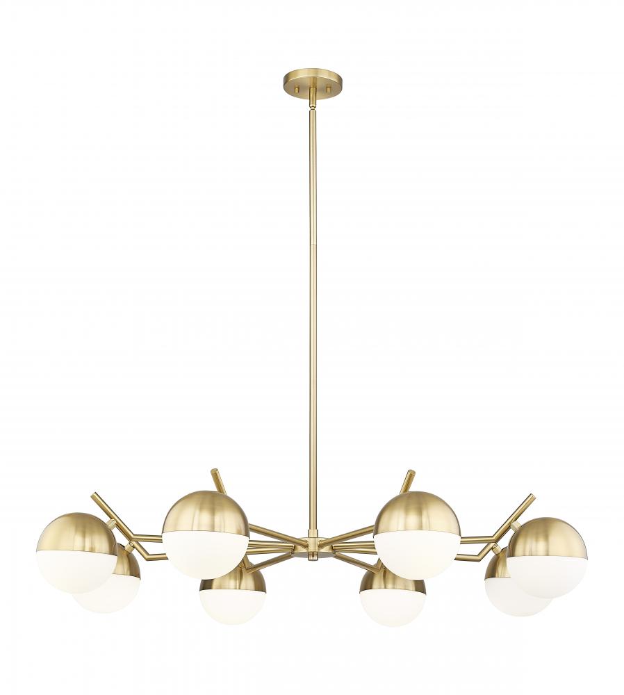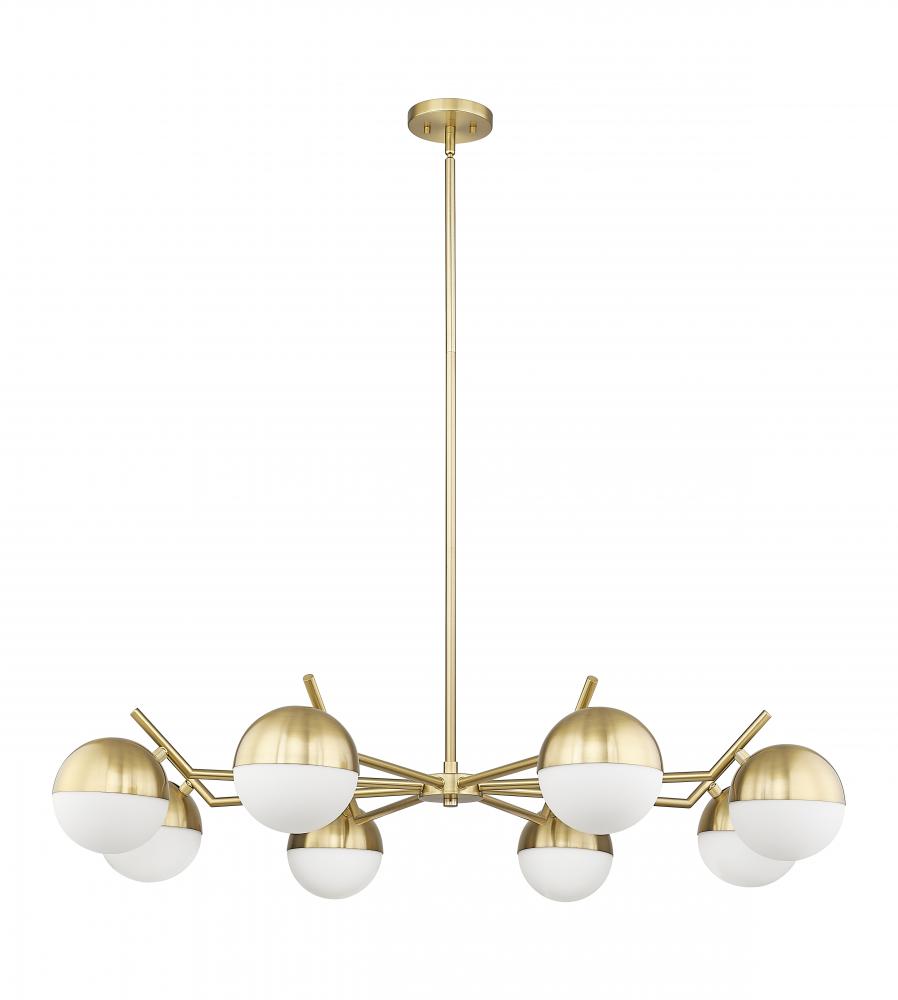 The warmth of a modern gold finish highlights this contemporary eight-light chandelier. Its round profile is highlighted with angular arms and a straight down rod, creating a clean-lined, structured silhouette perfect for your dining room. Each light features a metal shield and an opal glass orb, ensuring soft, welcoming ambiance.