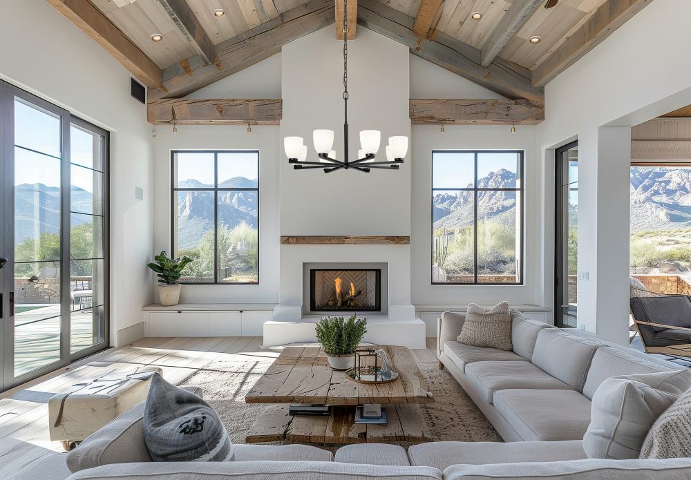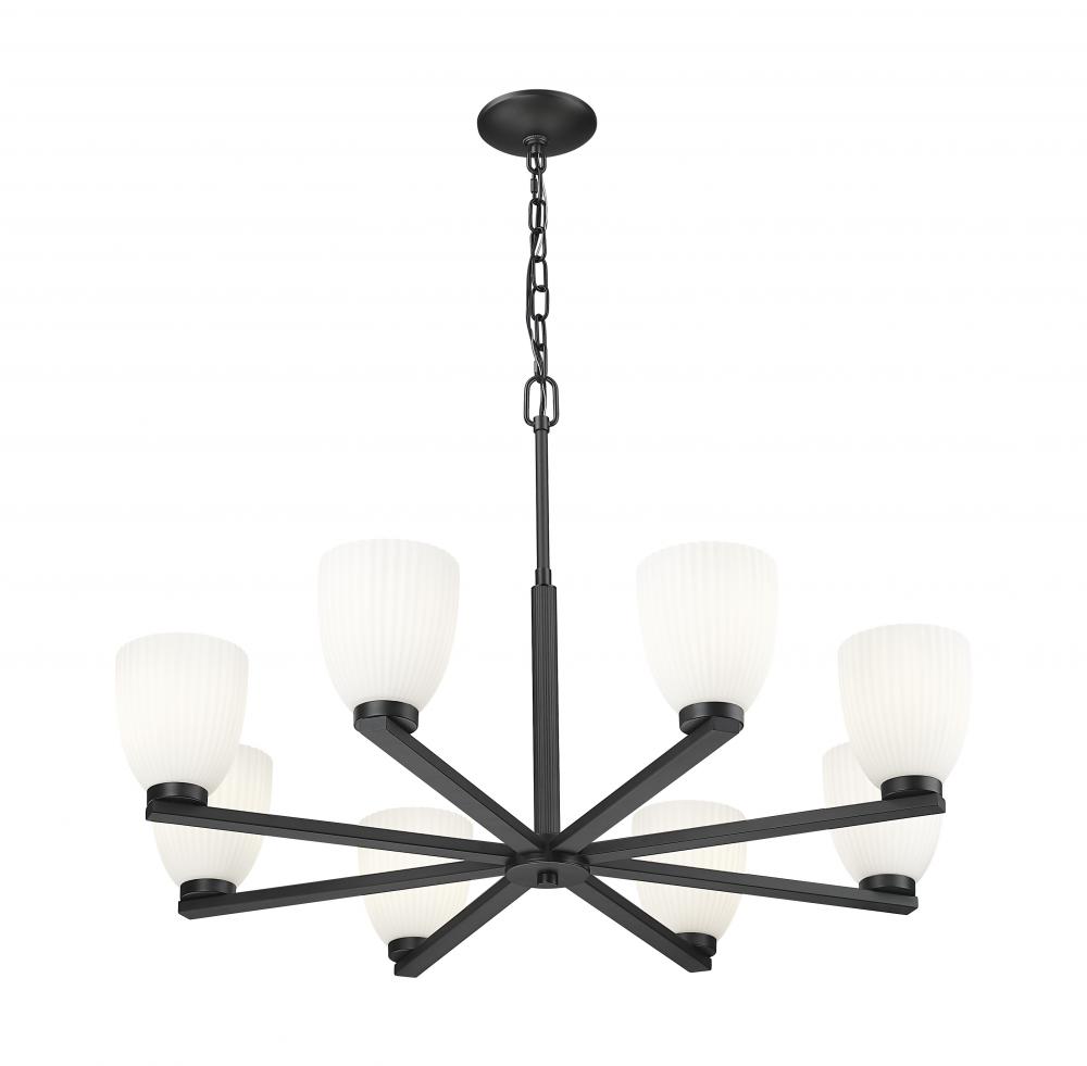 This eight-light chandelier pairs a dramatic matte black finish with the soft, sculptural presence of matte opal glass. Ribbed shades add depth to the glow, diffusing light into smooth, layered ambiance. It?s bold, architectural lighting that centers the room with intention.