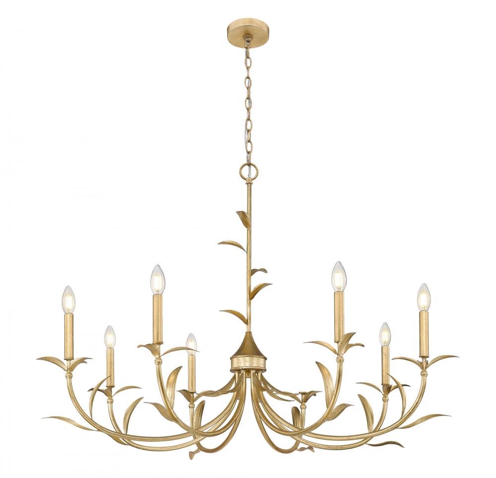 Ultimately elegant lighting takes on a botanical vibe in a chic, sophisticated eight-light chandelier crafted of warm gold leaf finish steel. Artisan flavor delivers exquisite silhouetting with curved arms and delicately shaped fronds, weaving in a natural aesthetic. Smooth holders and candelabra bulb bases make possible dimmable light levels, adding mood illumination to dining rooms, foyers, and large bedrooms.