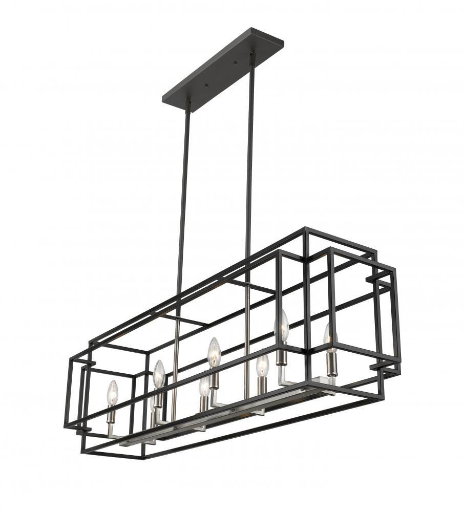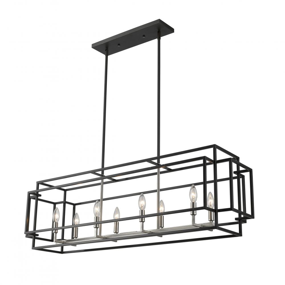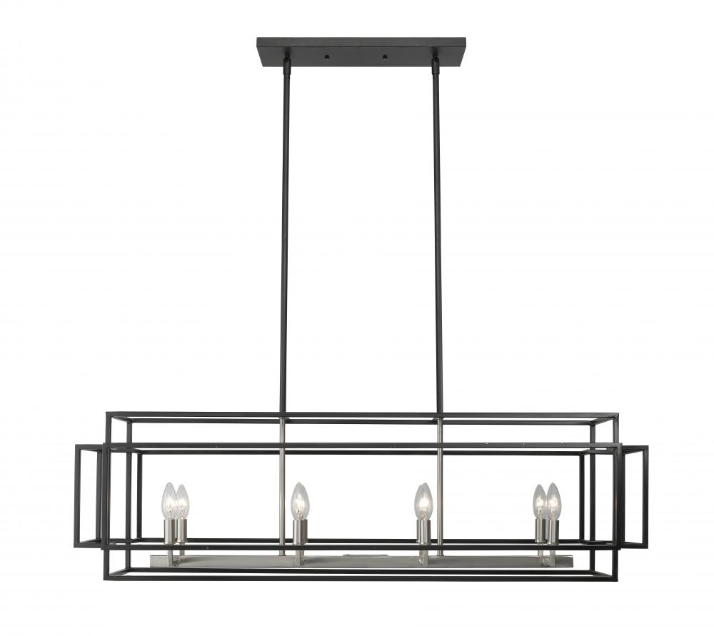 Add a sleek finishing touch to a custom designed kitchen or billiards space with this eight-light island pendant. A gorgeous mix of black and brushed nickel steel finishes ties together a modern, architectural open-box frame with stylish candelabra-style bulb bases, creating a compelling element that both illuminates and frames a high-use interior space.