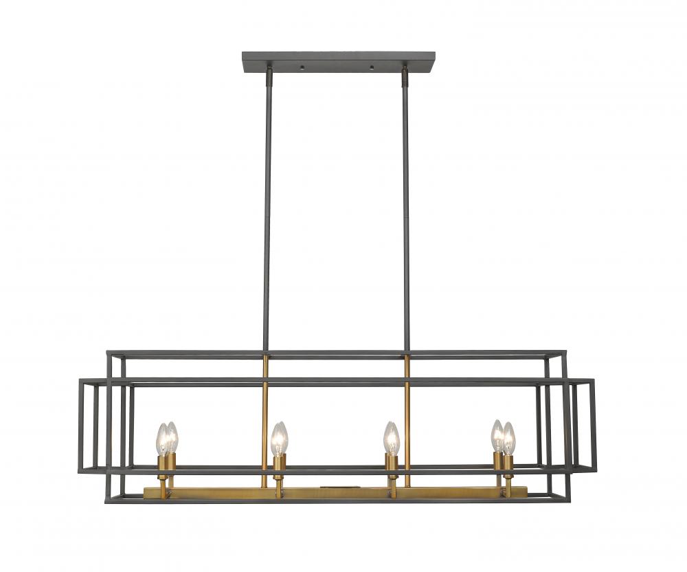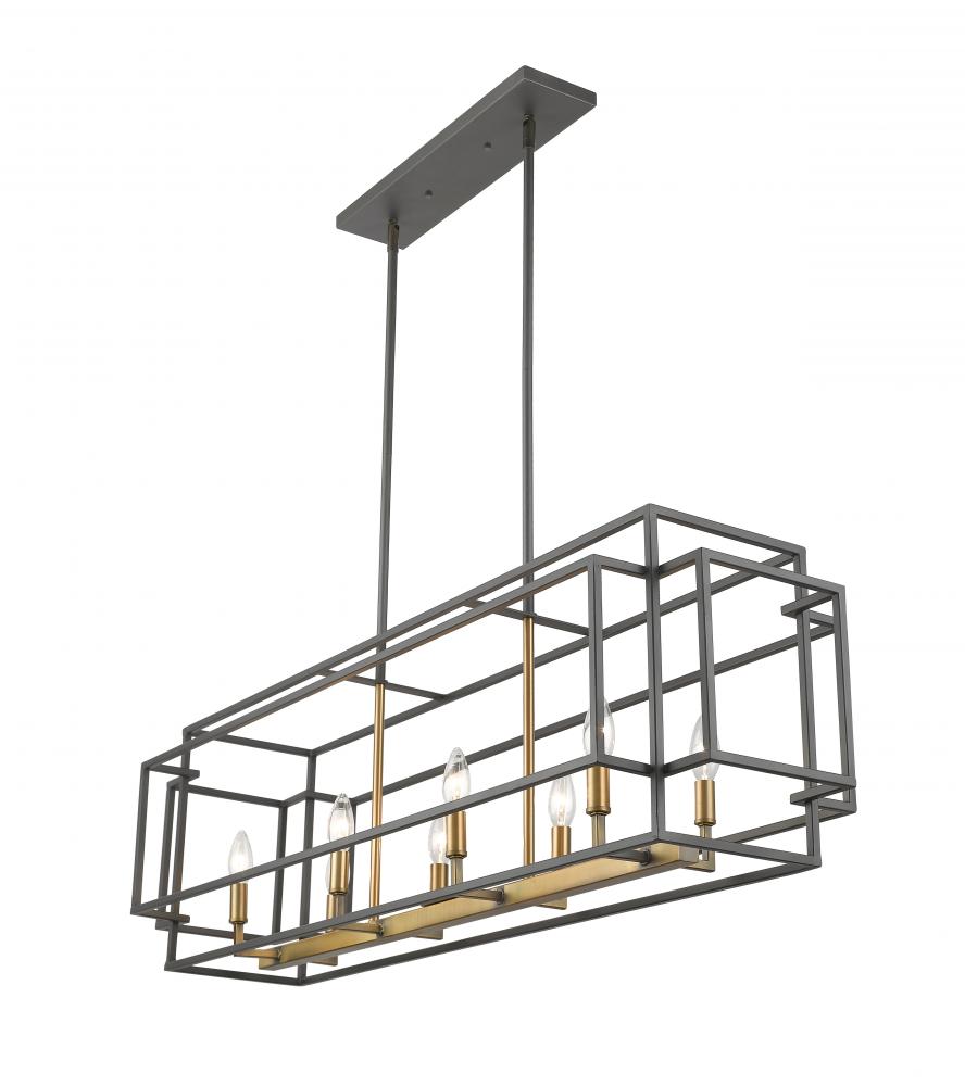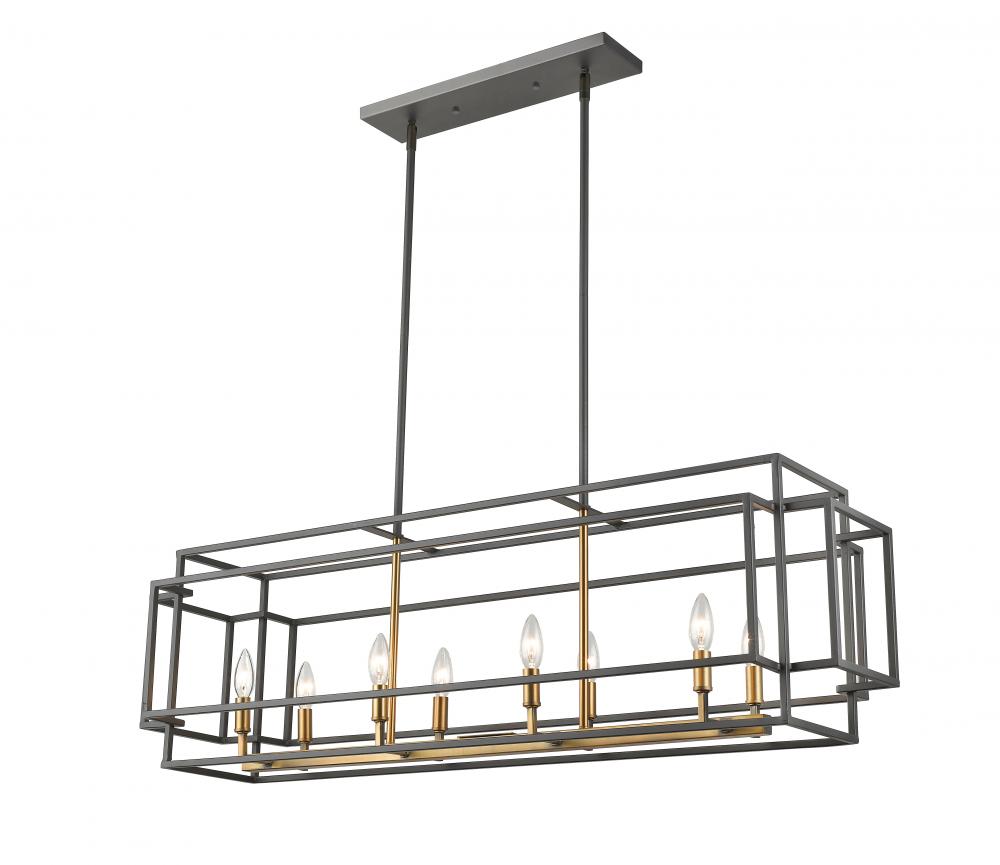 A stunning mix of warm finishes offer extra romantic style in this eight-light island/billiard pendant. Its rugged yet slender steel frame delivers an open-concept geometric effect that shows off charming candelabra-style bulb bases, resulting in an exquisite and versatile fixture to illuminate an important living area.