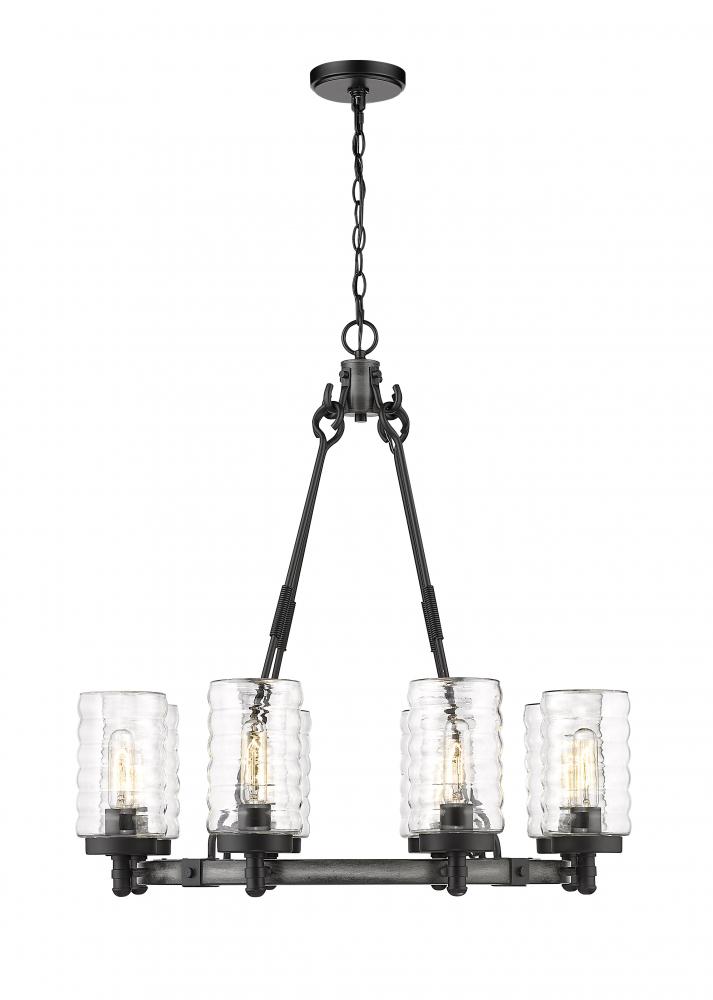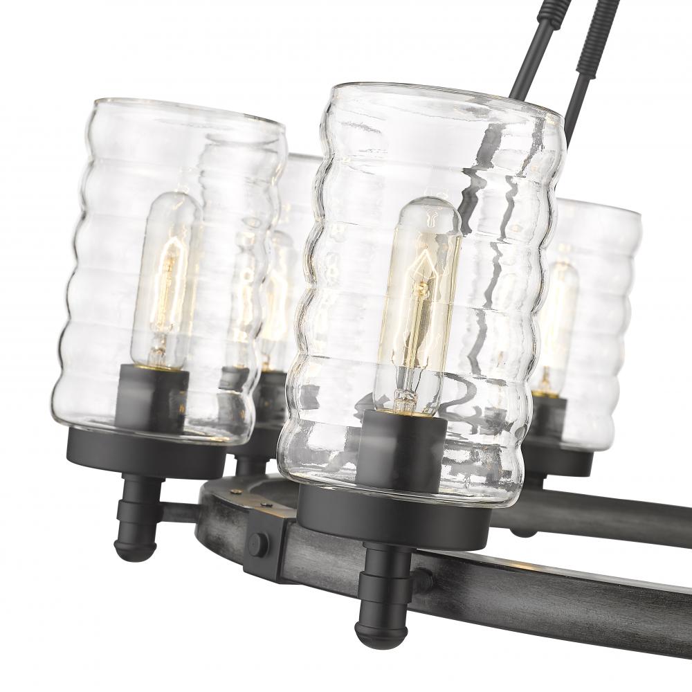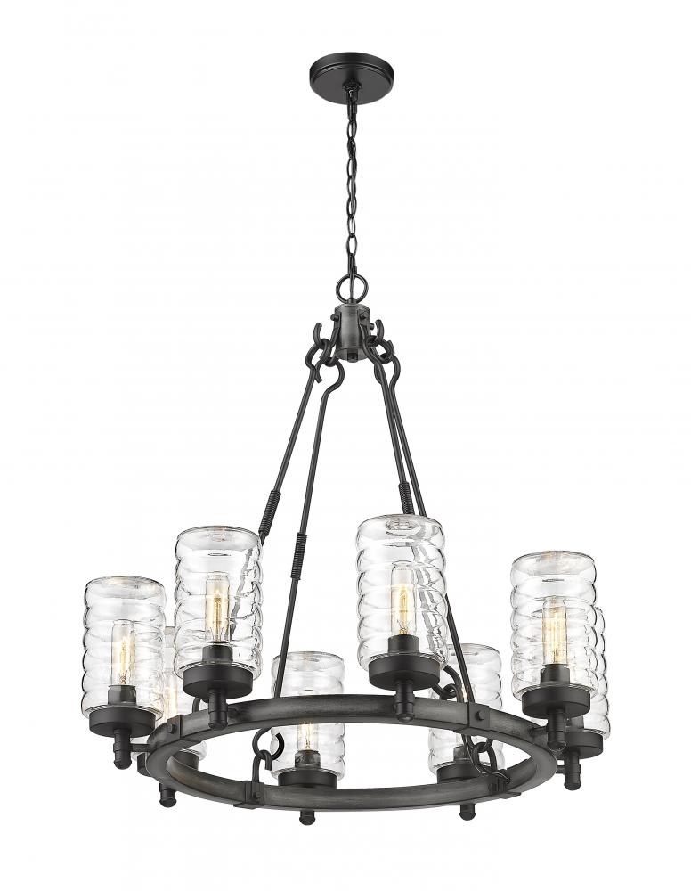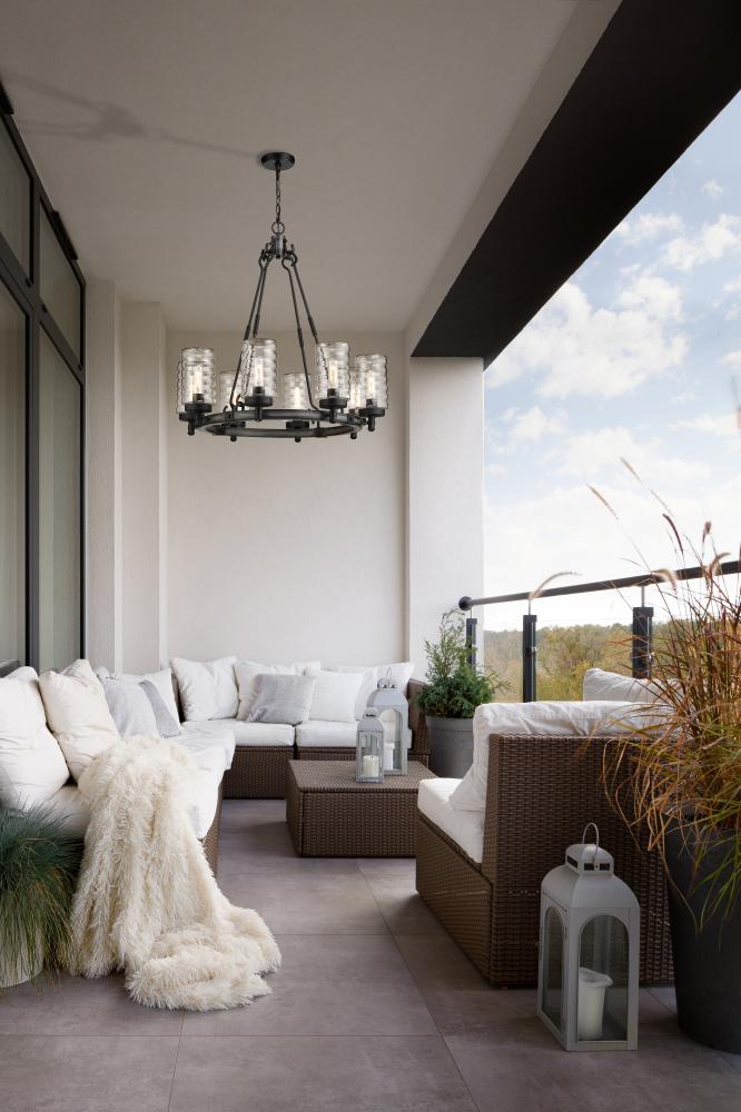 Elegant castle-inspired ambiance moves to exterior entertaining spaces, placing a premium on fashionable lighting. The Tahoe eight-light outdoor pendant features a circular chandelier-style silhouette made of ashen barnboard finish steel with cable accents. Clear cylindrical shades feature a hint of texturizing to complement the industrial vintage charm of its overall aesthetic.