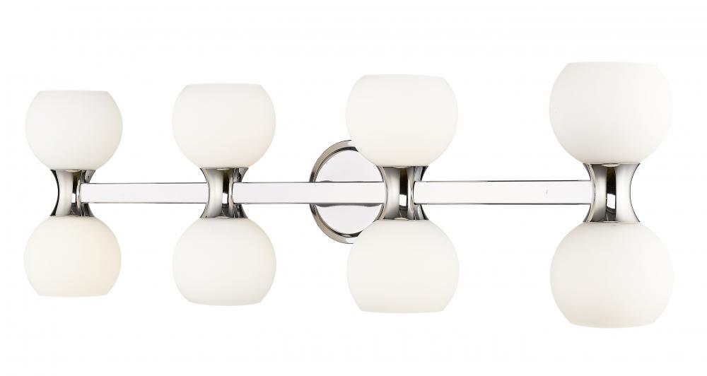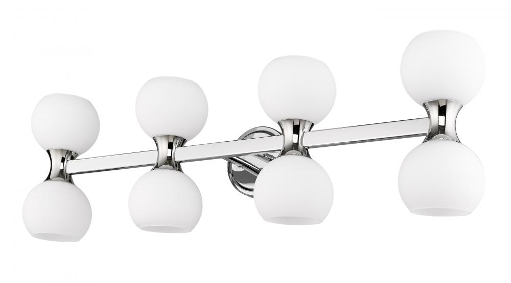 Mid-Century Modern style and Art Deco attitude reflect in a bathroom vanity light with a sense of sophistication and strong ambient lighting. This eight-light vanity light from the Artemis collection checks all the boxes for a compelling design and convenient uplighting and downlighting infused by matte opal glass open globes. Linear sensibility joins alluring curves in a radiant chrome finish steel frame, wrapping up a host of decadent features.