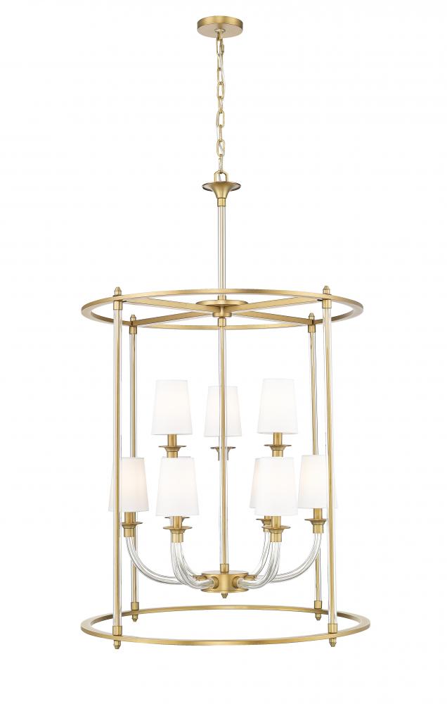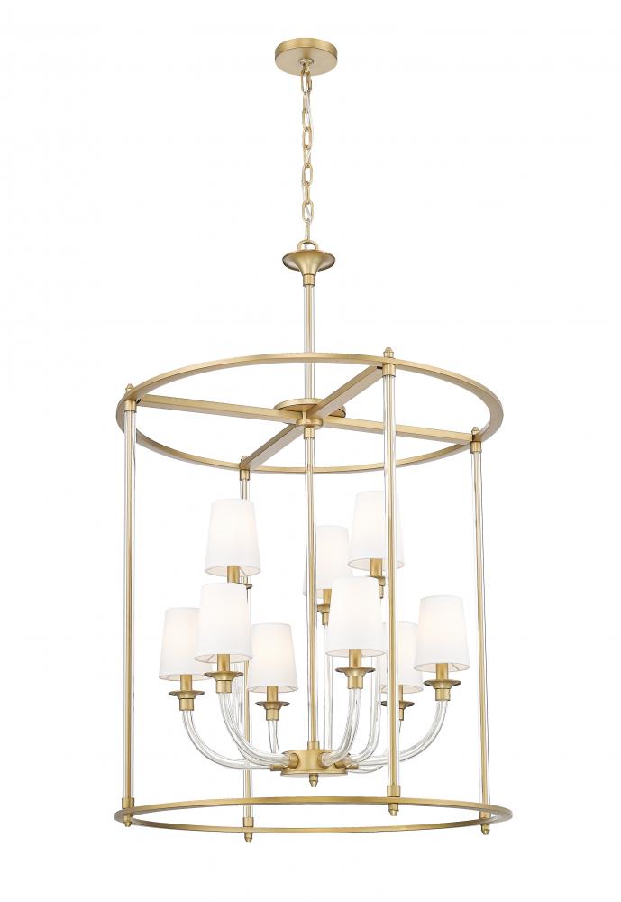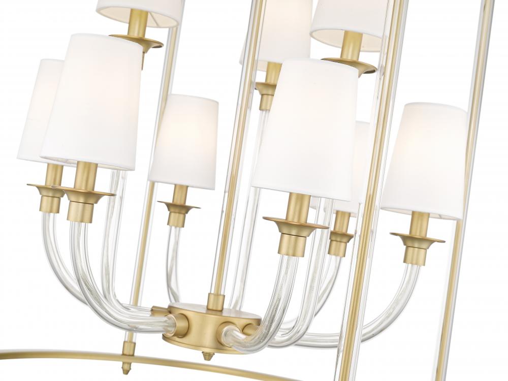Staggered tiers and the warmth of a rubbed brass finishing create a wonderful combination for this modern nine-light chandelier. Slender, curving glass arms add a sense of delicacy to the fixture, which boasts a round, open frame that defines the fixture. Tapering white fabric shades diffuse illumination and offer excellent flexibility and ambiance.