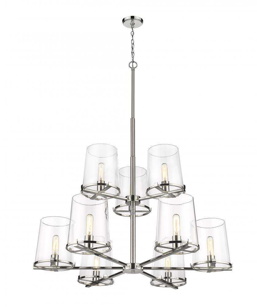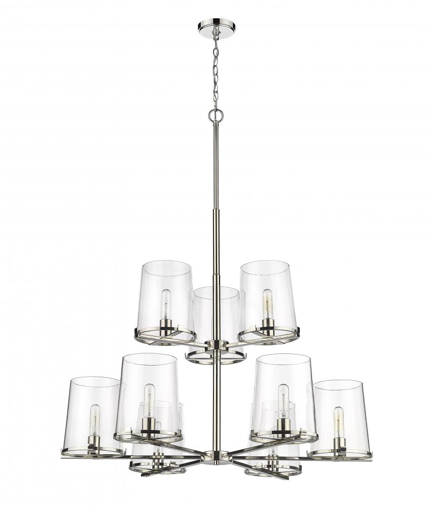 Whether modern or transitional, a custom living space deserves the tasteful design of the Callista nine-light chandelier. Fashioned with a hand-crafted polished nickel finish steel dual-layer frame and circular shade rings, it furthers sophisticated style with nine tapered clear glass shades. Make this fixture a focal point in a kitchen, dining, or main living space.