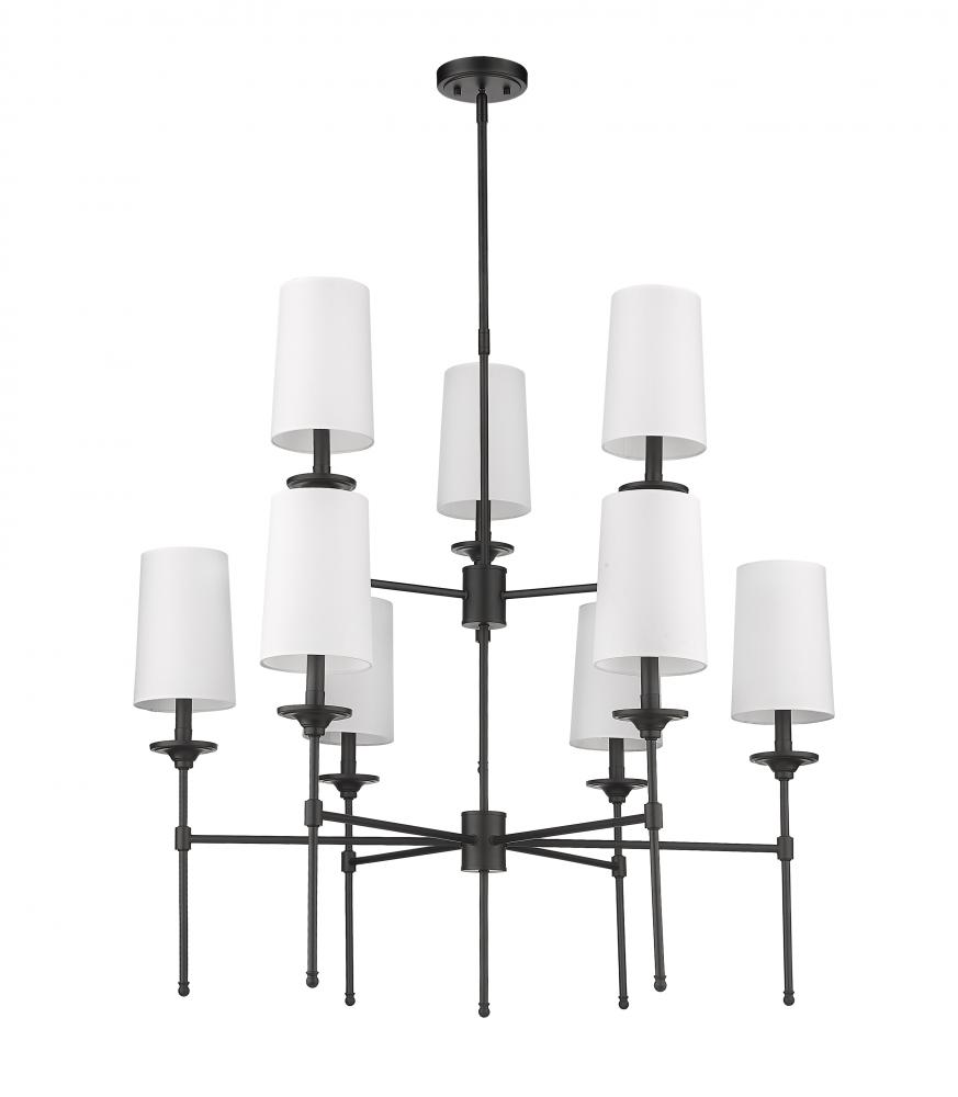 A bold mix of contrasting palette elements define the transitional character of the Emily nine-light chandelier, a multi-layered source of ambient lighting. Capture attention with a fixture featuring stemmed lamp-like lights topped with off-white fabric shades, and mounted to an intricate frame made of matte black finish steel. A tapered silhouette turns this chandelier into a compelling choice for highlighting dining spaces, entryways, and main living areas.