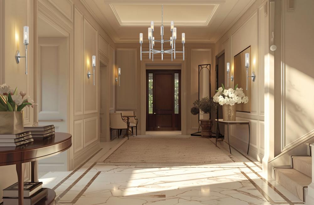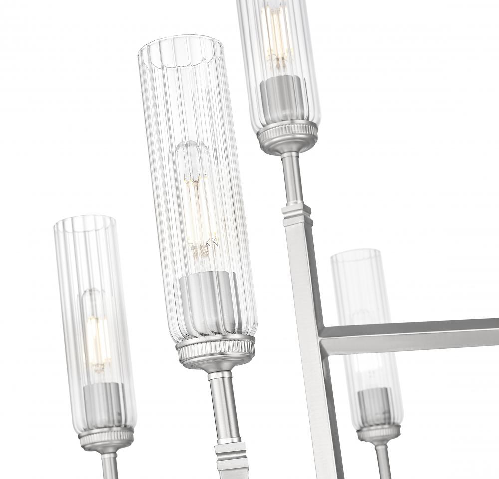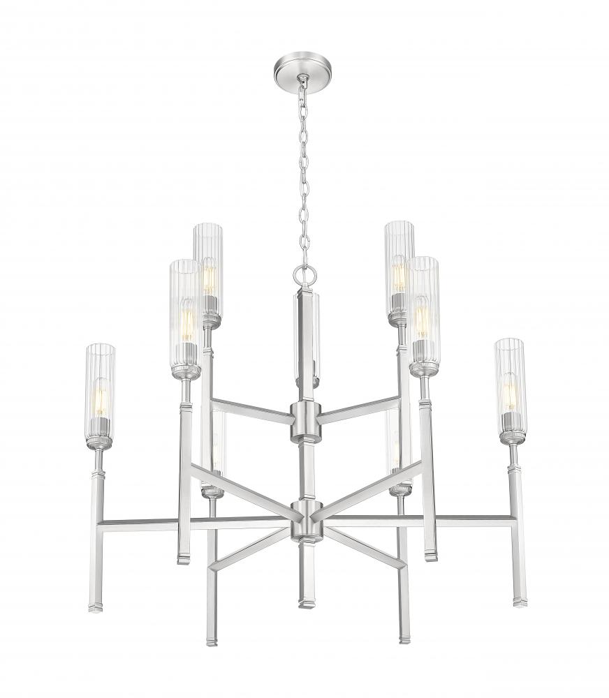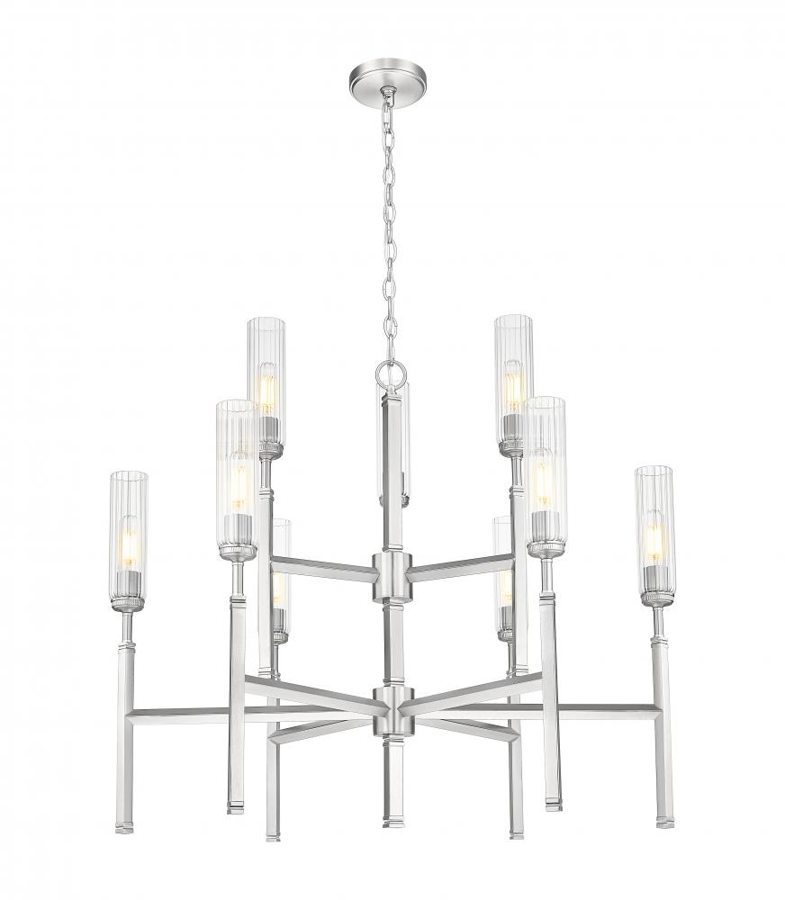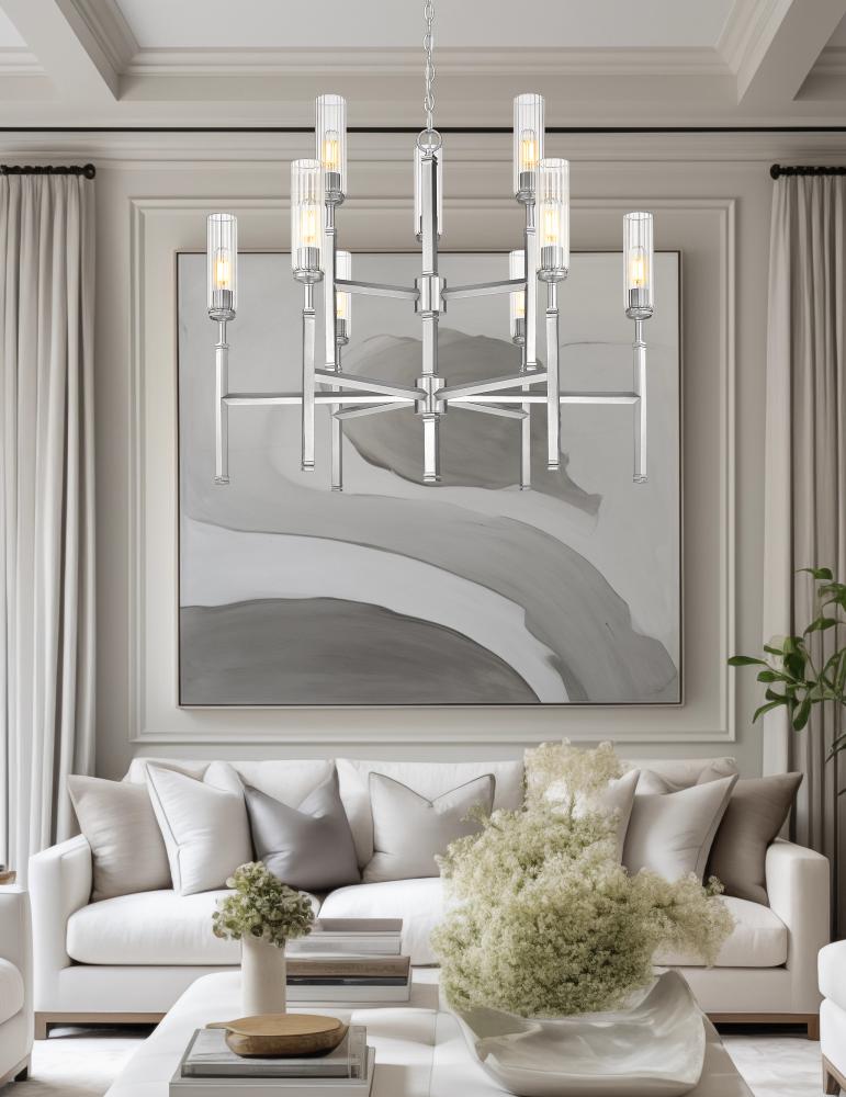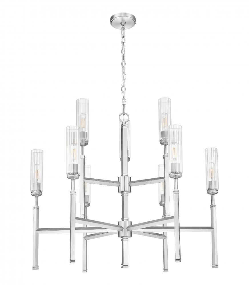 Tiered lighting maintains a compact silhouette for this chic nine-light chandelier. In a cool brushed nickel finish, this elegant fixture features slender fluted glass shades that diffuse illumination while reducing glare for excellent ambiance over a foyer or dining table. Slender stems complete the look of each light, evoking champagne flutes to create timeless sophistication.
