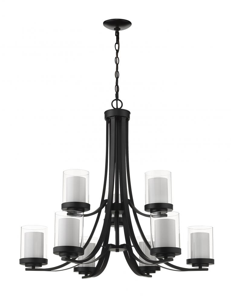Give your dining room or great room a chic, sophisticated update. This beautiful, matte black chandelier features nine glowing bulbs beneath nine delicate, glass shades that are matte opal on the inside and clear on the outside. An exquisite lighting option to highlight your refined sense of style.