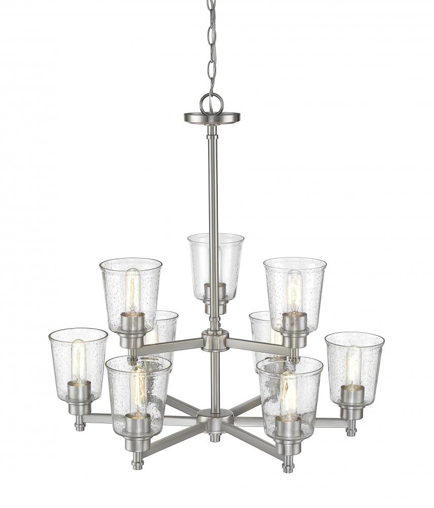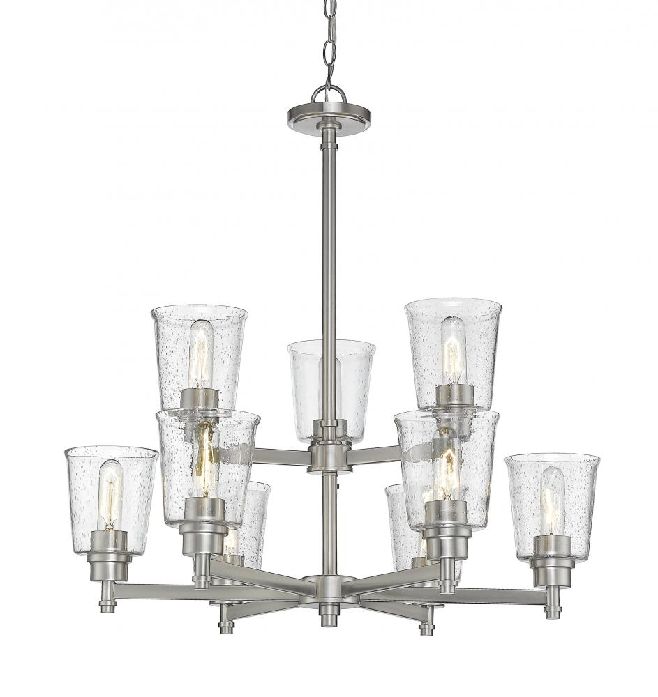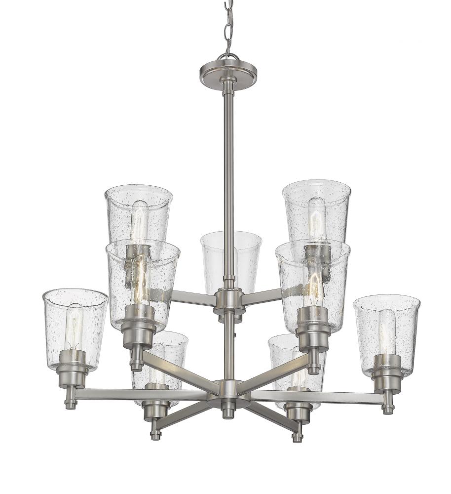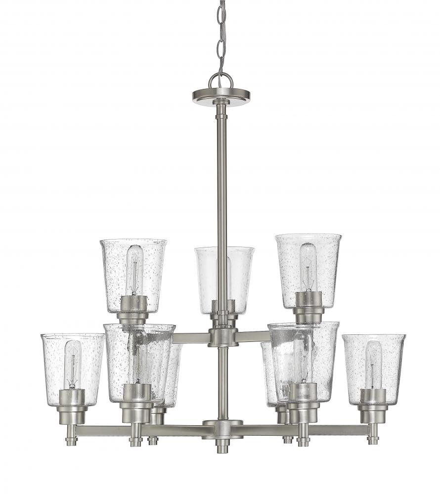 Bring a luxurious fixture to a contemporary or transitional space and enjoy the visual effect of lighting in levels. Fashioned from steel, the brushed nickel frame of this nine-light chandelier hosts an arrangement of romantic clear seedy glass shades in a contoured bell shape, yielding an inspiring decor enhancement that illuminates any space.