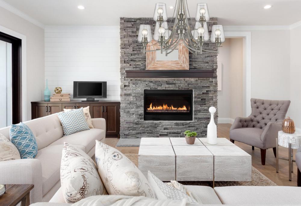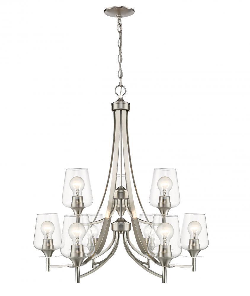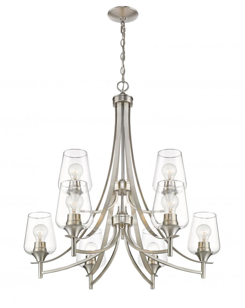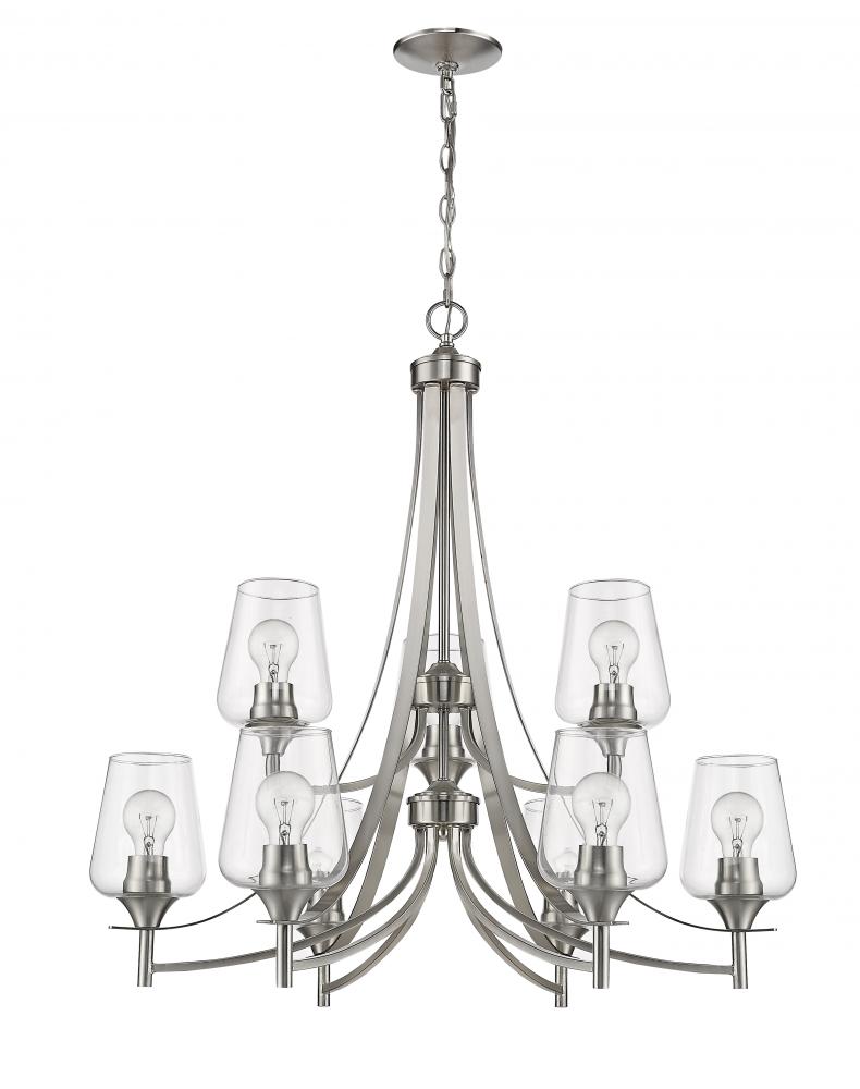 Designed with sleek metal lines and an elegant silhouette, this brushed nickel chandelier is a stunning home decor upgrade. This nine-light fixture features clear glass shades for a magnificent display of light.