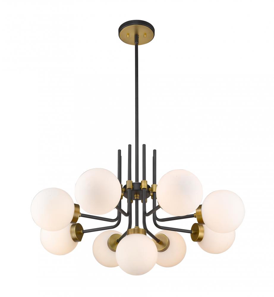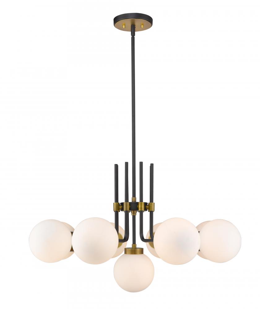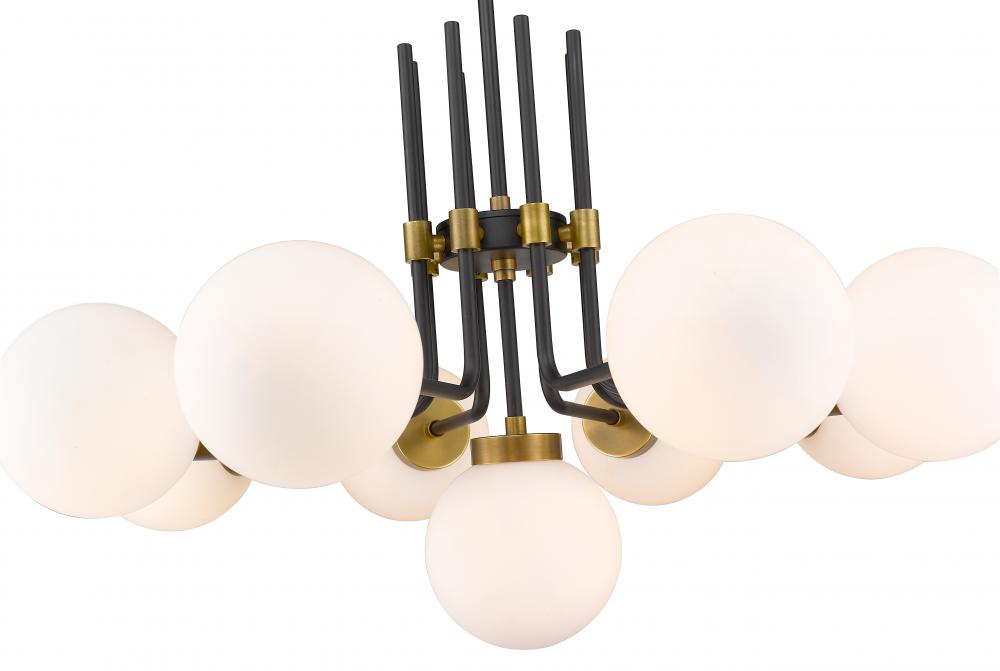 Rich tones and a majestic design highlight this nine-light chandelier for your home. Its fashioned with a matte black and olde brass finish and opal shades for the warm glow youre looking for. This elegant light is perfect for the dining room, foyer, hallway, or kitchen.
