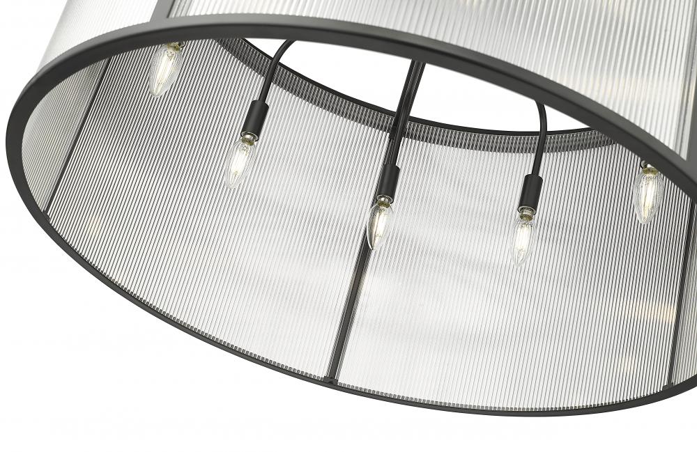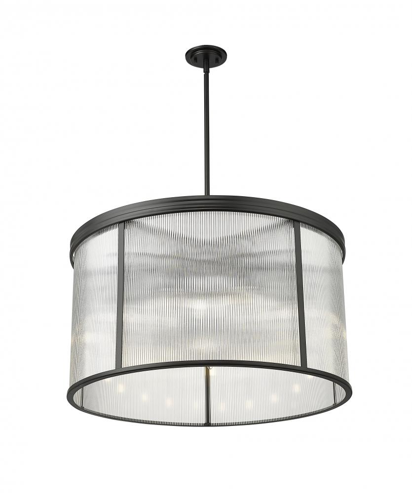 Modern energy infuses the timeless profile and deep matte black of a chic nine-light chandelier. Gorgeous centered over a dining table or living room sitting area, the chandelier pairs the soothing elegance of a drum silhouette with the character and textural dimension of architectural ribbed glass, creating a sum greater than its parts. its the perfect upgrade over a welcoming dining table or beautiful foyer.