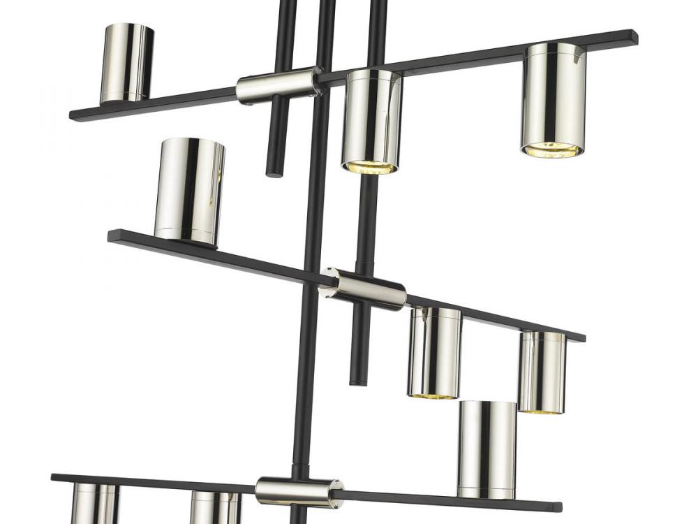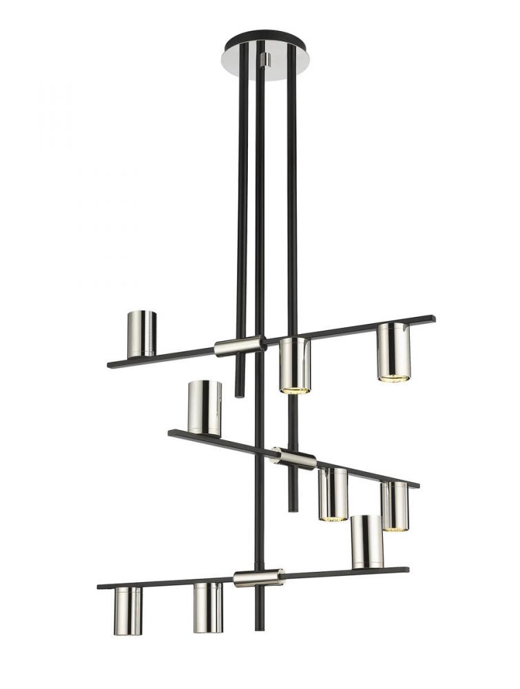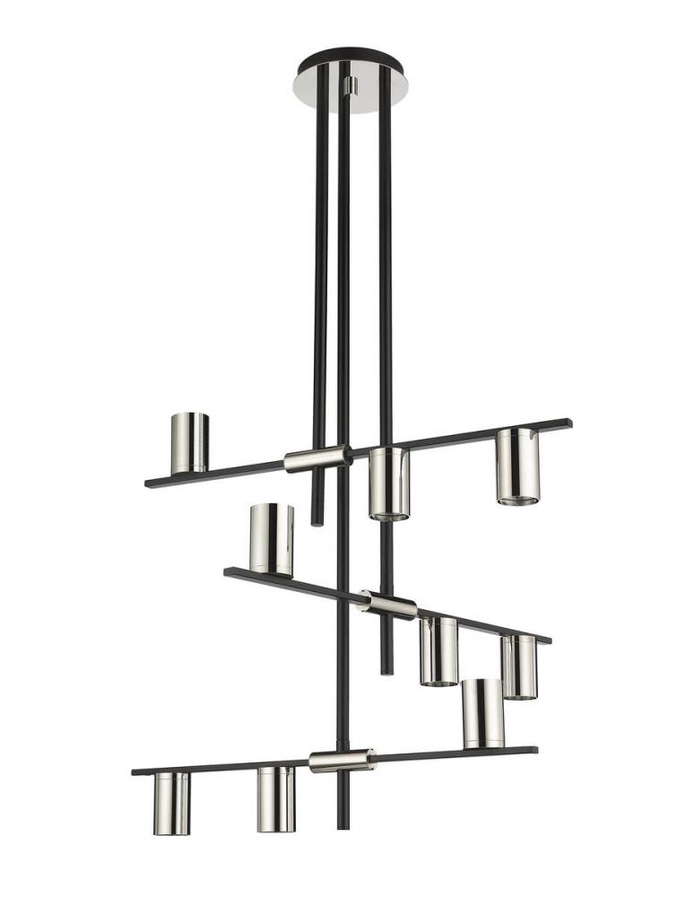 Embrace a rich heritage reflecting Native American tribes and their storied pipes, adding this nine-light chandelier from the Calumet collection to a high-visibility space. Modern and transitional join with industrial-inspired aesthetics to produce a linear pieced fixture crafted of matte black finish steel. Glowing cylinder shades fashioned of polished nickel finish steel direct illumination in both up and down directions.