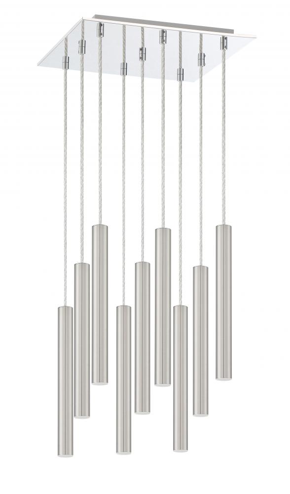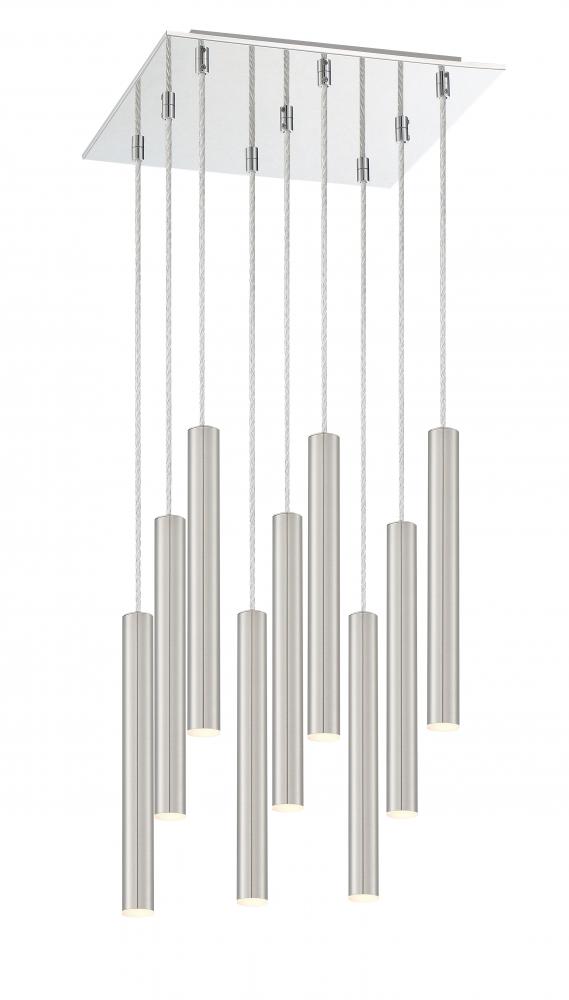 The radiant metallic finish and clean lines from this nine-light pendant light feature a brushed nickel finish. Windchime-inspired, the stylish and elongated shapes on the silhouette create a stunning centerpiece.