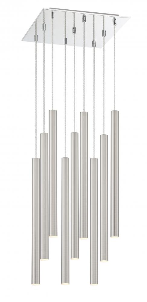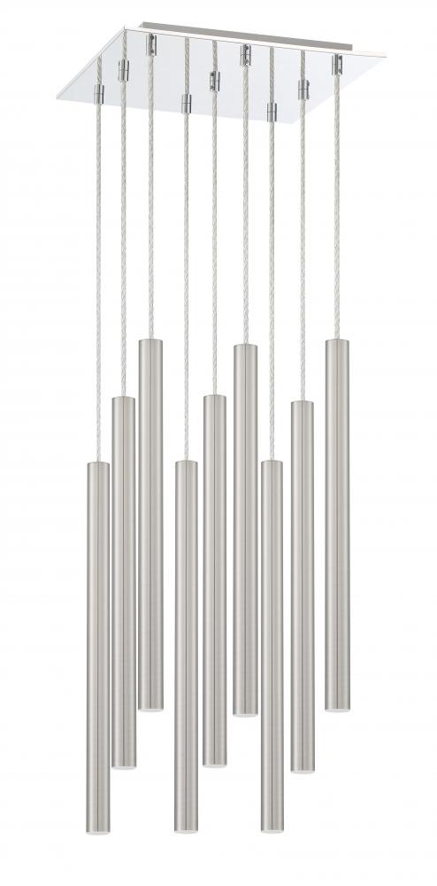Celebrate sleek sophistication with this nine-light pendant light in brushed nickel. Elongated in style, the modern silhouette cleans up spaces with metallic radiance.
