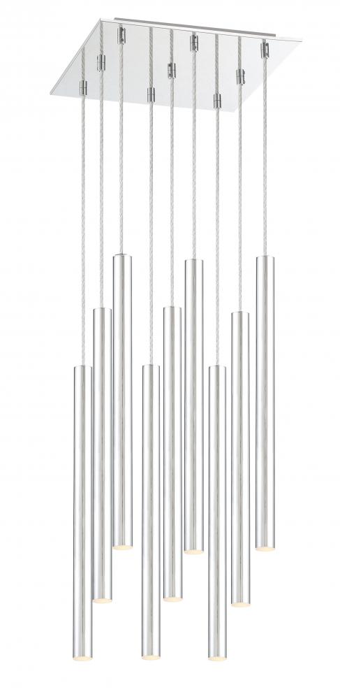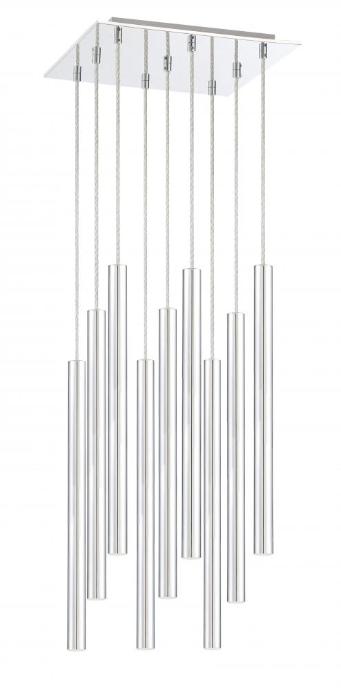 Shiny chrome from this nine-light pendant light elevates modern spaces with style. Sleek and stunning, the elongated lines in the silhouette radiate brightly over a living room.