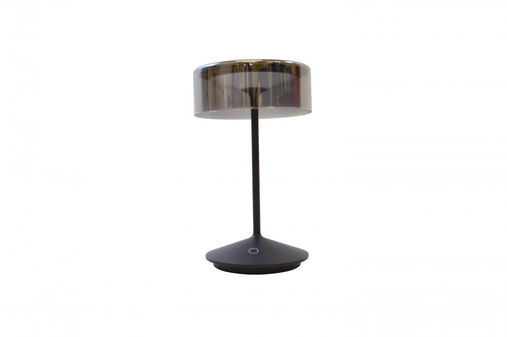Crystal is a modern, low-profile cordless lamp featuring a glass shade resting atop a futuristic, die-cast aluminum body.