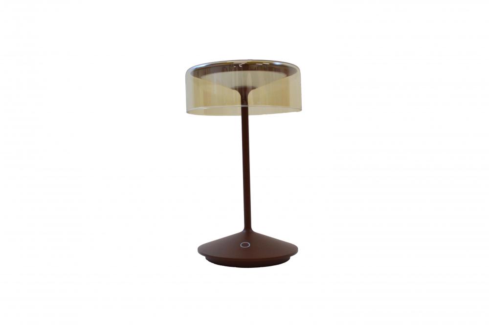 Crystal is a modern, low-profile cordless lamp featuring a glass shade resting atop a futuristic, die-cast aluminum body.