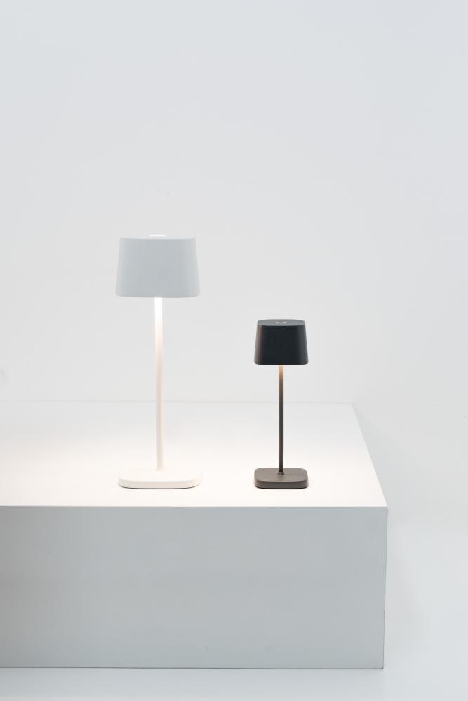 Ofelia Micro is a battery-operated and rechargeable portable table lamp. The lamp features dimming touch control and dimmer memory function, which adjusts the light level and memorizes the dimming steps every time it is switched-on. The light level will correspond to that which was previously set. It also has 3-CCT color temperature selection for 2200K (candle light), 2700K (warm white), and 3000K (cool white). The integrated LED module is designed and engineered to produce controlled downlight.