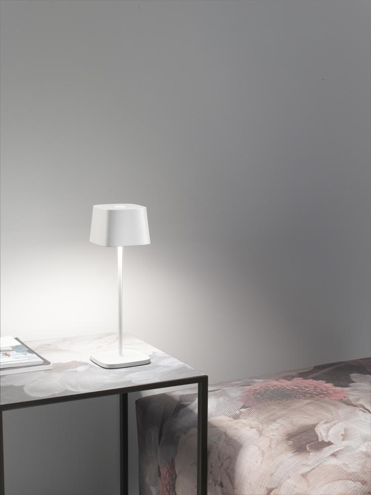 Battery-operated and rechargeable portable table lamp. The lamp features dimming touch control and dimmer memory function, which adjusts the light level and memorizes the dimming steps every time it is switched-on. The light level will correspond to that which was previously set. It also has 3-CCT color temperature selection for 2200K (candle light), 2700K (warm white), and3 000K (cool white). The integrated LED module is designed and engineered to produce controlled downlight.