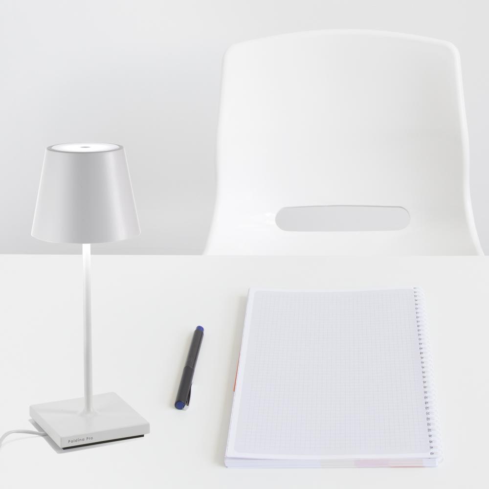 Battery-operated and rechargeable portable table lamp. The lamp features dimming touch control and has 3-CCT color temperature selection for 2200K (candle light), 2700K (warm white), and 3000K (cool white). The integrated LED module is designed and engineered to produce controlled downlight and a gentle uplight glow.