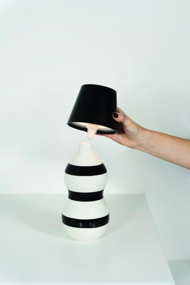 The silicone stopper 'cork' on the bottom of the shade can be inserted into a bottle to create a luminous object.
