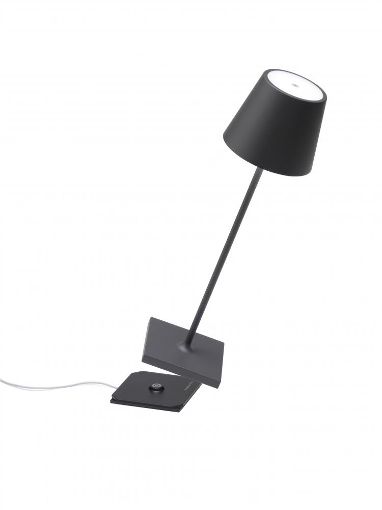 To recharge your Poldina Pro Mini lamp, plug the provided charging base into an outlet and place the lamp on the base.