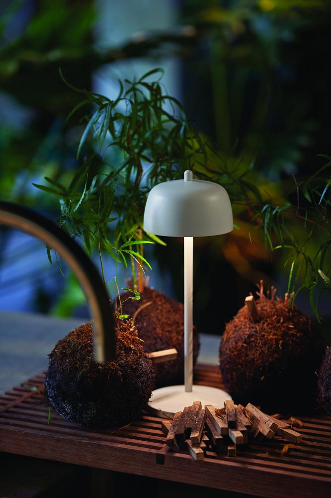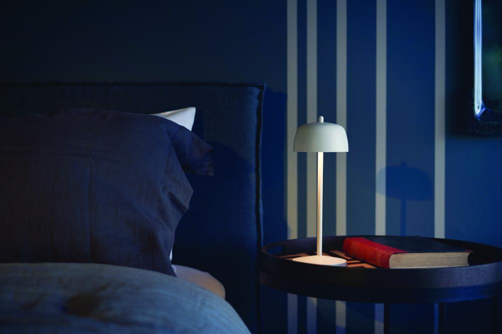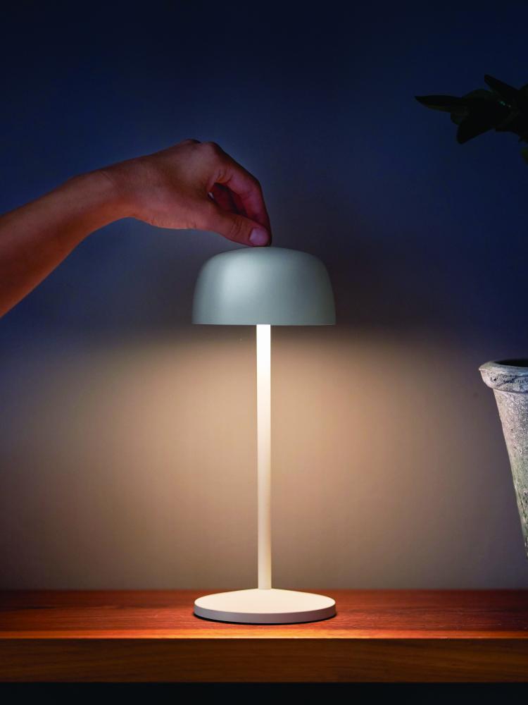 Theta merges its elegant modern profile with a retro, vintage feel. Battery-operated and rechargeable portable table lamp. The lamp has a multi-function control knob on top of the metal shade that can be used for dimming and for continuous tunable color temperature from 2200K (candle light) to 3000K (cool white). The integrated LED module and the optical polycarbonate diffuser mounted in the metal shade produce controlled down light.