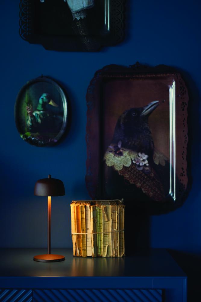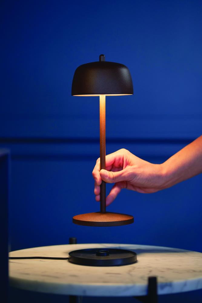 Theta merges its elegant modern profile with a retro, vintage feel. Battery-operated and rechargeable portable table lamp. The lamp has a multi-function control knob on top of the metal shade that can be used for dimming and for continuous tunable color temperature from 2200K (candle light) to 3000K (cool white). The integrated LED module and the optical polycarbonate diffuser mounted in the metal shade produce controlled down light.
